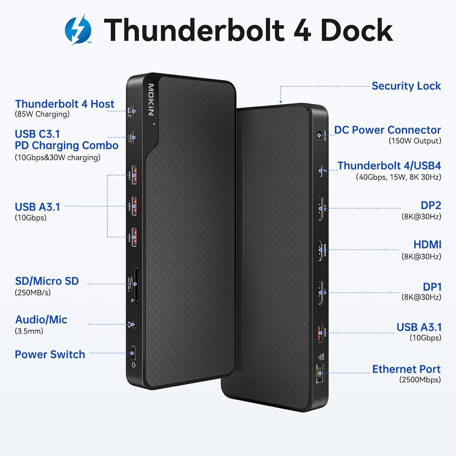 - 「What You Get」1* Mokin Thuderbolt4 USB C Docking Station, Thunderbolt4 Cable, 150W DC adapter, User Guide, and friendly customer service.