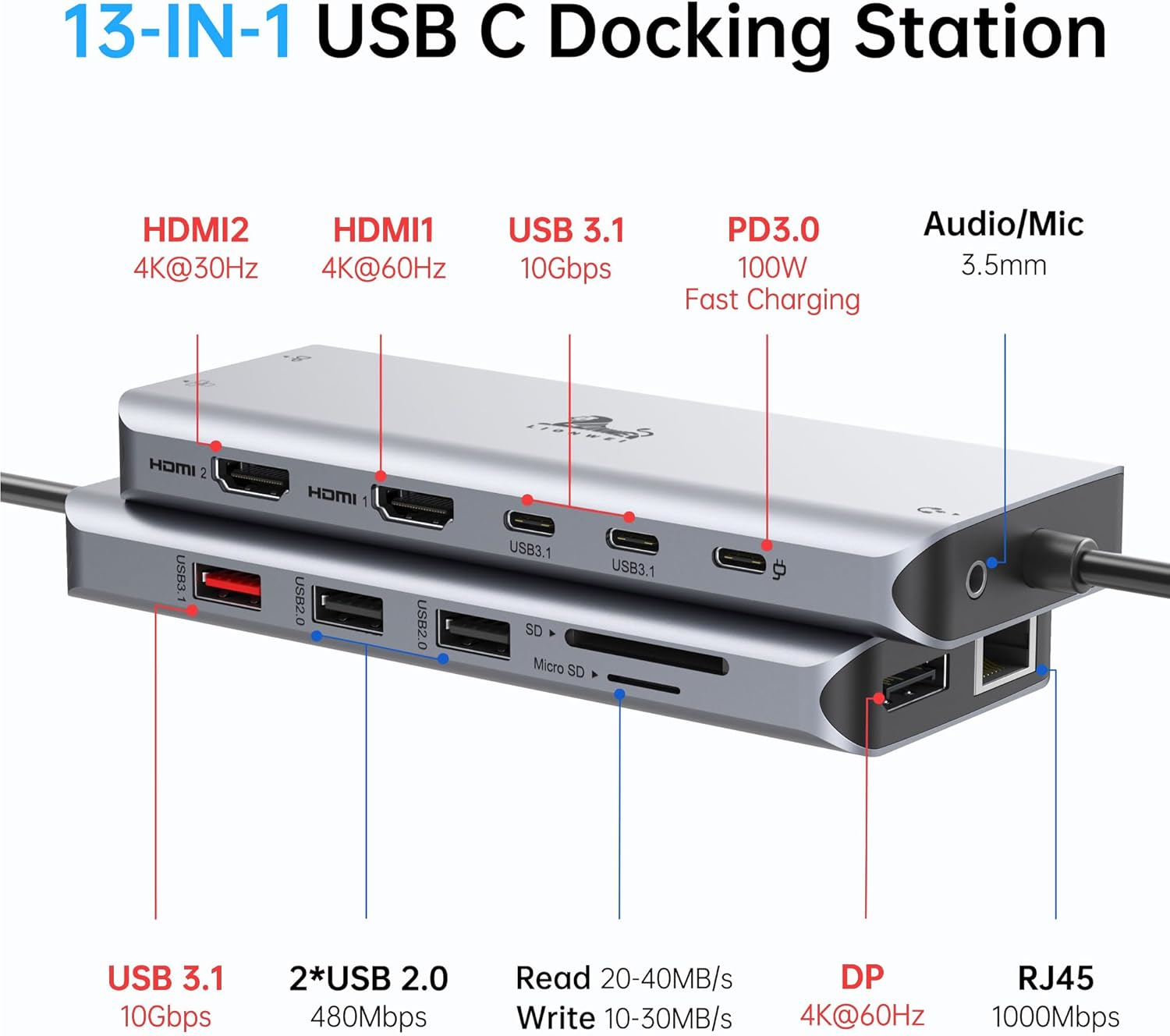 - 【13 in 1 Laptop Docking Station】Plug and play. With this usb c hub multiple adapter, you get 2*4K HDMI, DisplayPort, 100W PD charging port, 3 USB C/A 3.1(10Gbps), 2*USB A 2.0, SD/TF card reader, Ethernet port, 3.5mm audio
