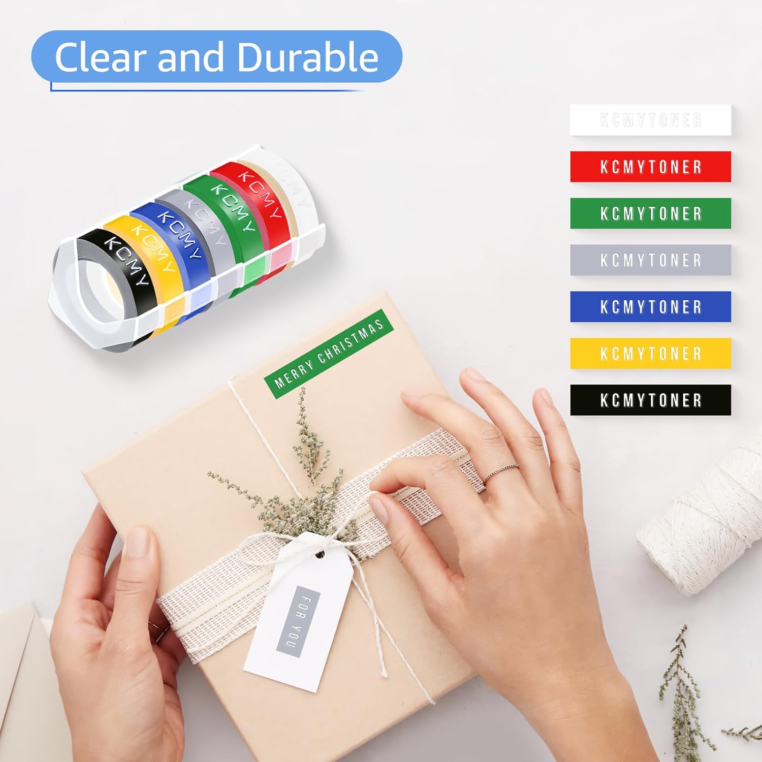 - Quantity: KCMYTONER 5 Rolls 3D Plastic Embossing Label Tapes Different Color Combo Set Compatible for Dymo Embossing Label Makers, 1x White Print on Red, 1x White Print on Green, 1x White Print on Blue, 1x White Print on Yellow, 1x White Print on Black; Dimension(each item): Width: 1/2" (12mm) Length: 9.8 feet (3m).