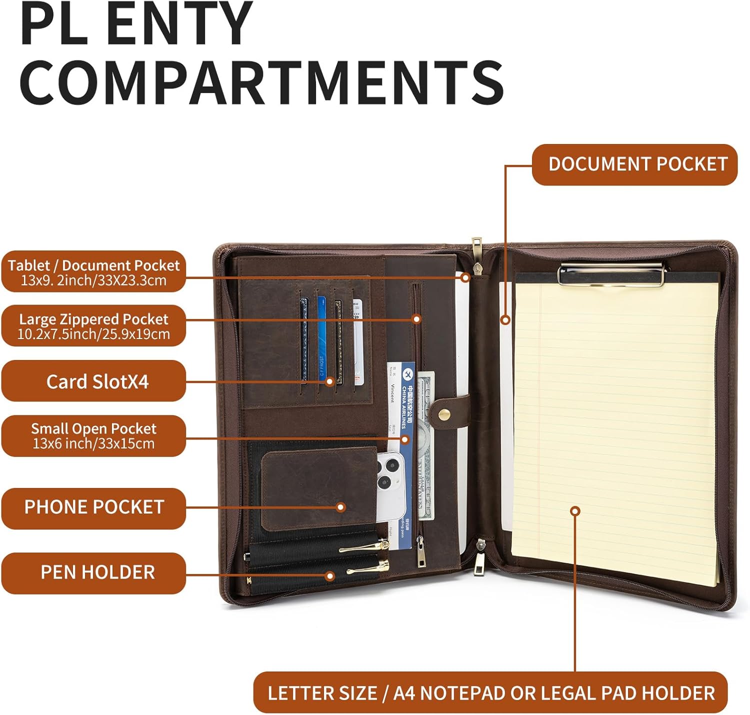 - MULTIFUNCTIONAL ORGANIZER FOR BUSINESS PEOPLE – With rationally designed multi-compartments and pockets in different sizes, our leather folder portfolio accommodates and organizes all your business essentials such as legal pads, loosen leaves, pens, cell phone, tablet, With the robust zipper closure, you can keep your stuffs safe and neatly organized inside the pad folio.Right side writing pad holder is designed for letter size (8.5” X 11.0”) replaceable notepad, spring clip.