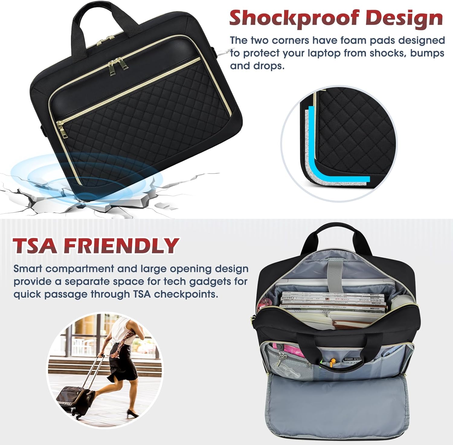 - 【Convenience & Comfortable Design】TSA friendly, separate tech compartment and large opening design allow you to quickly pass through the security check. The laptop bag for women features removable, adjustable padded shoulder strap that can adjust the length to fit different heights and reduce shoulder pressure. Sturdy PU handle to ensure comfortable carrying. Luggage strap allows the laptop messenger bag to slide over the luggage tube, freeing up your hands.