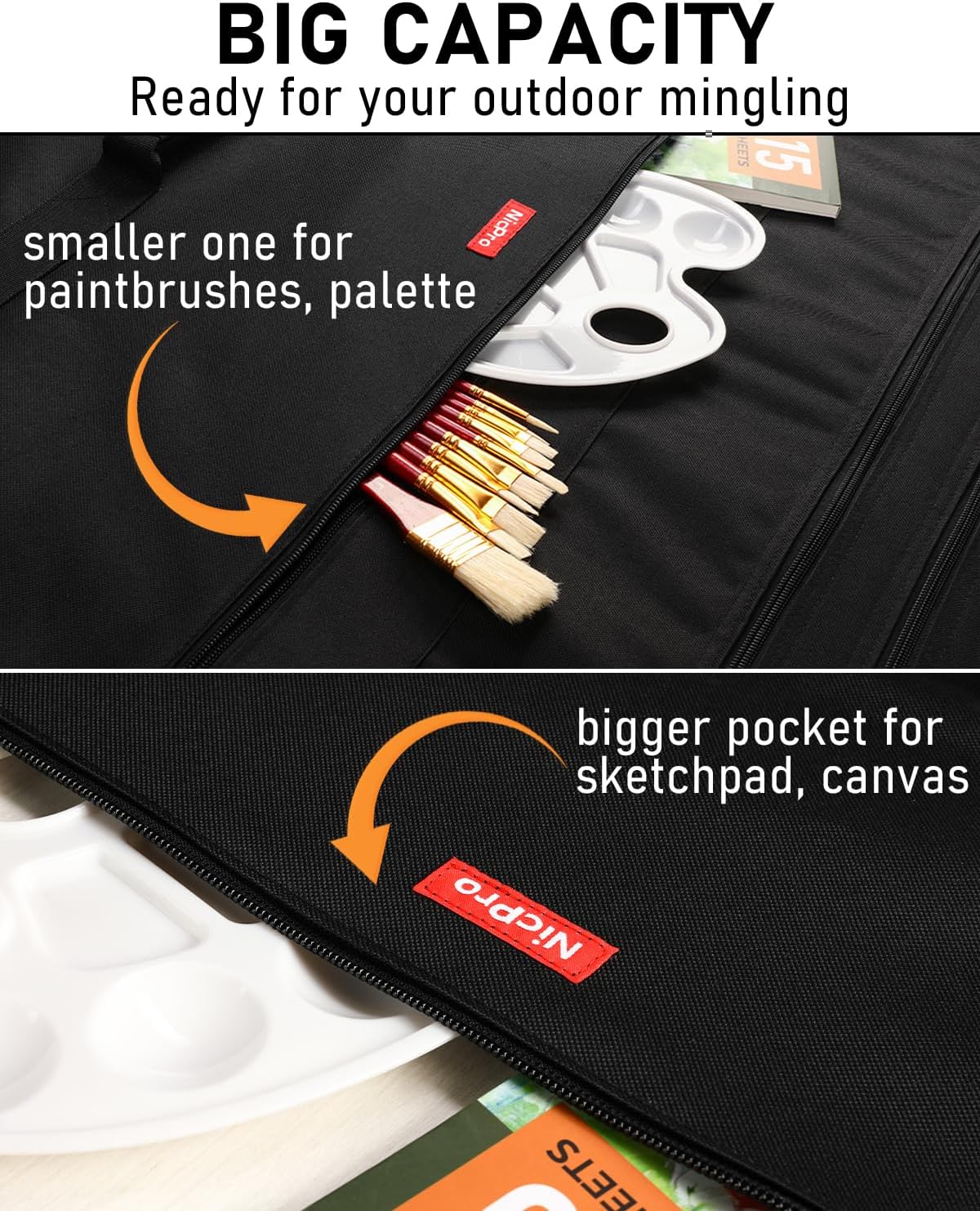 - Double Water-Proof Design. Nicpro Art Portfolio Bag is not only made of water-proof fabric, but also have an interior water-repellent coating. This diamond art portfolio bag can keep artwork from water damage, making it suitable for outdoor use or during transportation in unpredictable weather conditions. This ensures that paintings, sketches, or other artwork remain pristine and unaffected by moisture, even in rainy environments