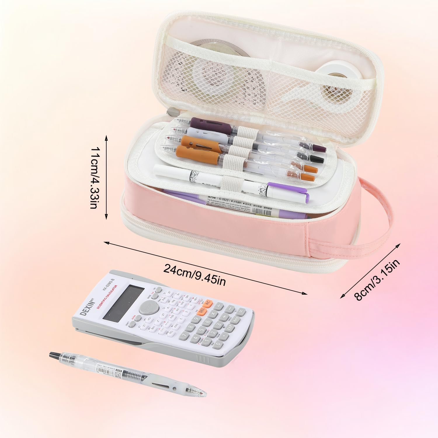 - Large Pencil Case - The dimensions of this pencil case are 9.45 x 4.35 x 3.15 inches, it can hold up to 70-90 pens/pencils, 20cm rulers, erasers, calculators, scissors, and other learning tools.