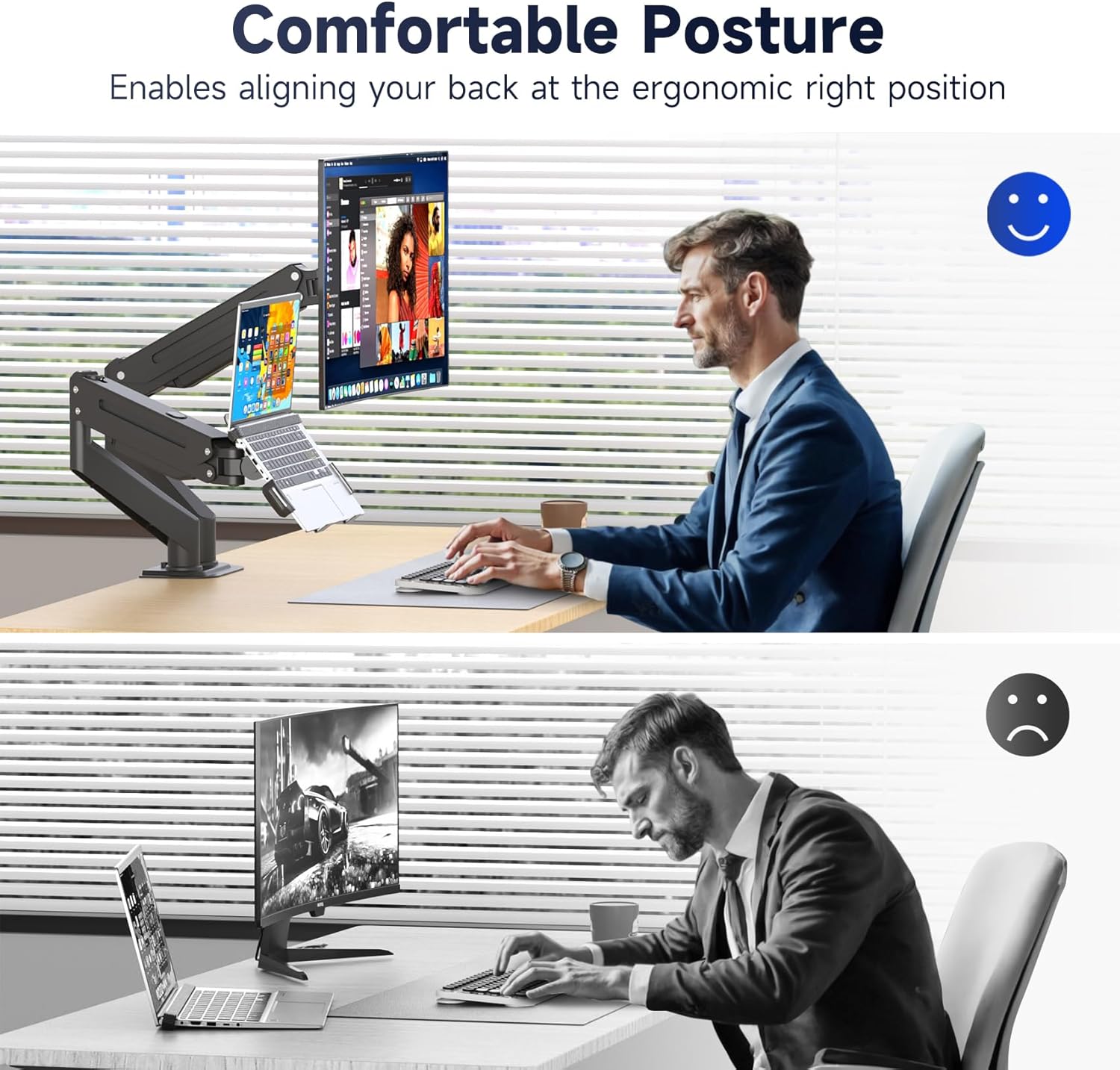 - Space Saving: The 2 in 1 function laptop mount for desk has internal cable management pass-through features to organize wires and cables.This monitor arm mount allow using laptop and monitor at the same time without switching screens. You can also use two monitors at the same time.