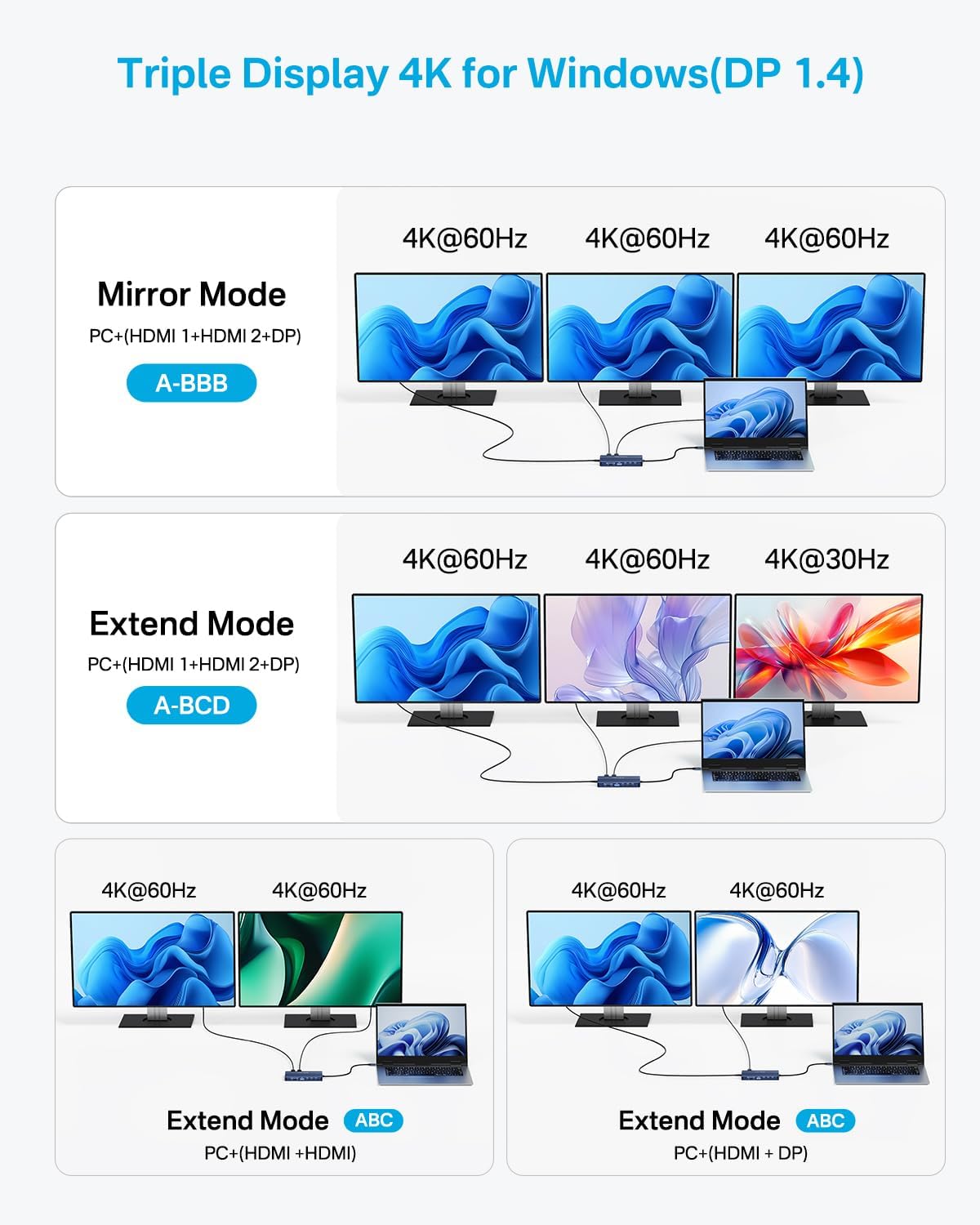- Laptop Docking Station Triple Display: This usb c to DP/HDMI adapter supports single 4K@60Hz display and triple 4K@30Hz displays(under DP1.4). ONLY Windows system support MST and SST(Mirror & Extend Mode). MacOS system DOES NOT support MST