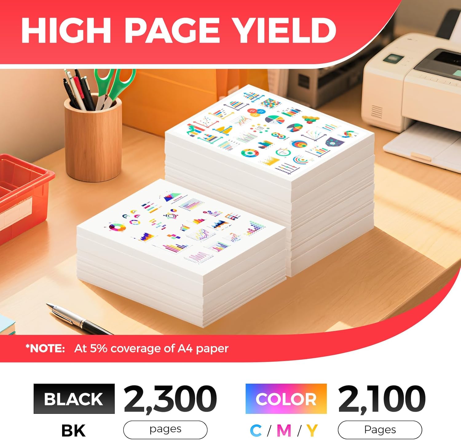 - High-Yield: up to 2,300 pages per 055/055H Black and 2,100 pages per 055/055H Color (Total 8,600 pages, 5% coverage).