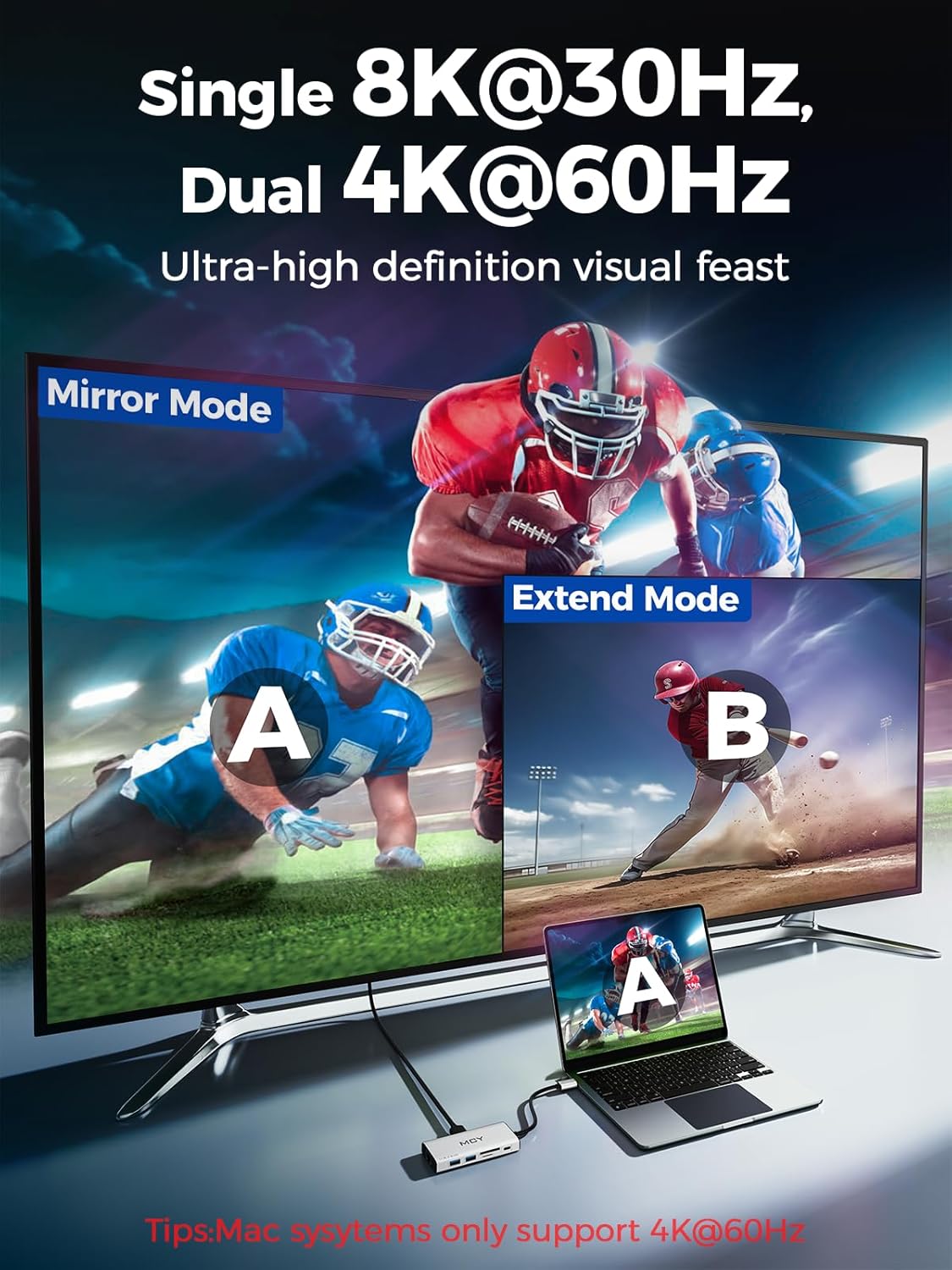 - ăDual Display Ultra HD OutputăThe docking station dual hdmi supports single 8K, dual 4K@60Hz mirror/extend modes. Ideal USB C to HDMI adapter for MacBook/Windows laptops. Ultra clear images bring you a visual feast!(Note:1ăHDMI1 8K requires DP1.4 protocol PC support (Mac systems only support 4K ). 2ăFor MAC, the display on both external monitors will be identical.)