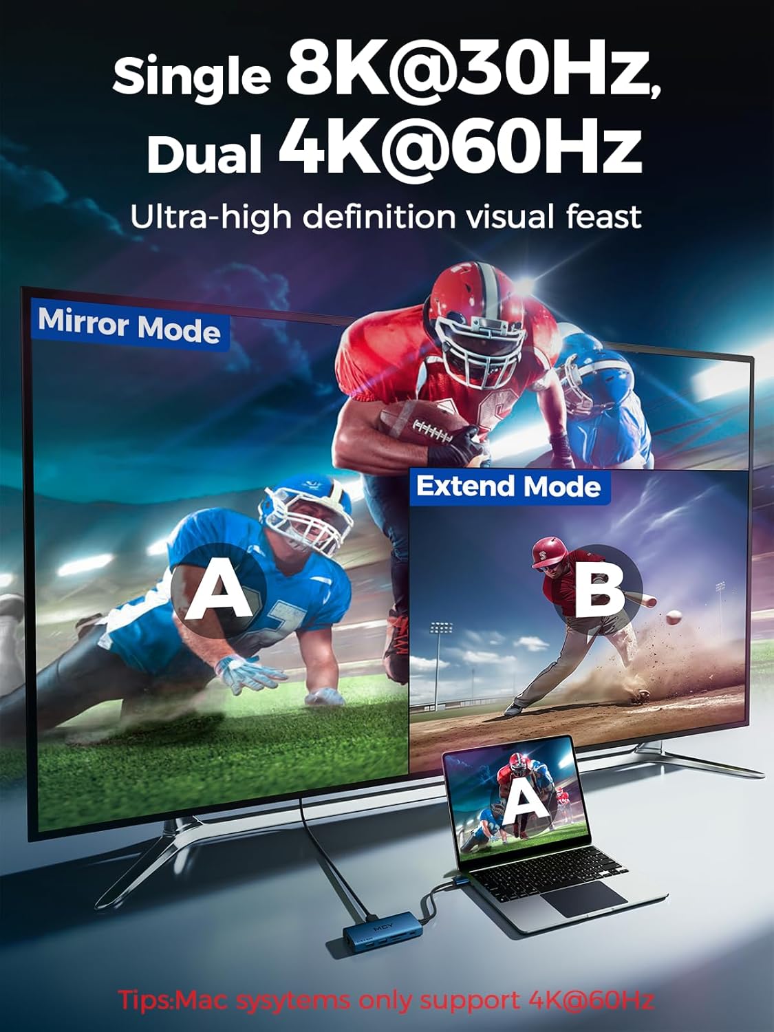 - ăDual Display Ultra HD OutputăThe docking station dual hdmi supports single 8K, dual 4K@60Hz mirror/extend modes. Ideal USB C to HDMI adapter for MacBook/Windows laptops. Ultra clear images bring you a visual feast!(Note:1ăHDMI1 8K requires DP1.4 protocol PC support (Mac systems only support 4K ). 2ăFor MAC, the display on both external monitors will be identical.)