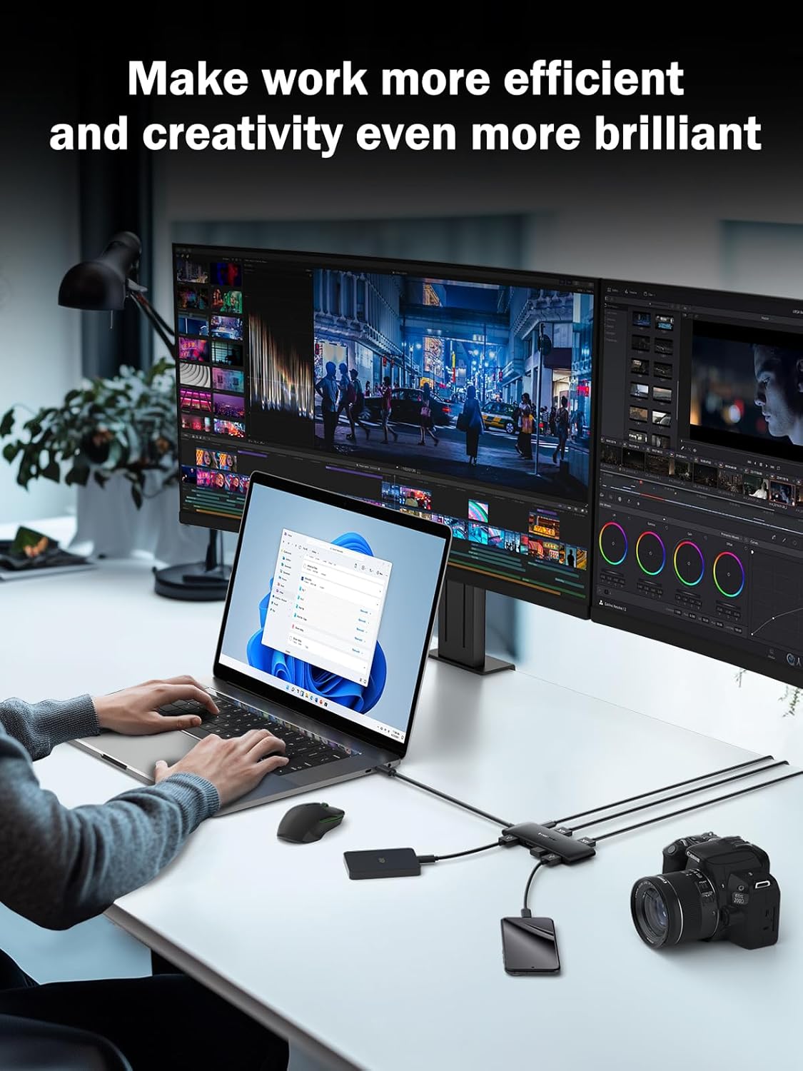 - 【Powerful PD 100W Charging】: This dual monitor docking station support power up to 100W input and max 85W output while charging laptop, no need to worry about power storage, fast and stable, ensuring efficient work. Please note that the charging cable and power adapter are not included. Additionally, the port only supports one-way charging; it does not facilitate data transfer or video output, PD100W requires a 100w+ charger or original charger(100w+ required)