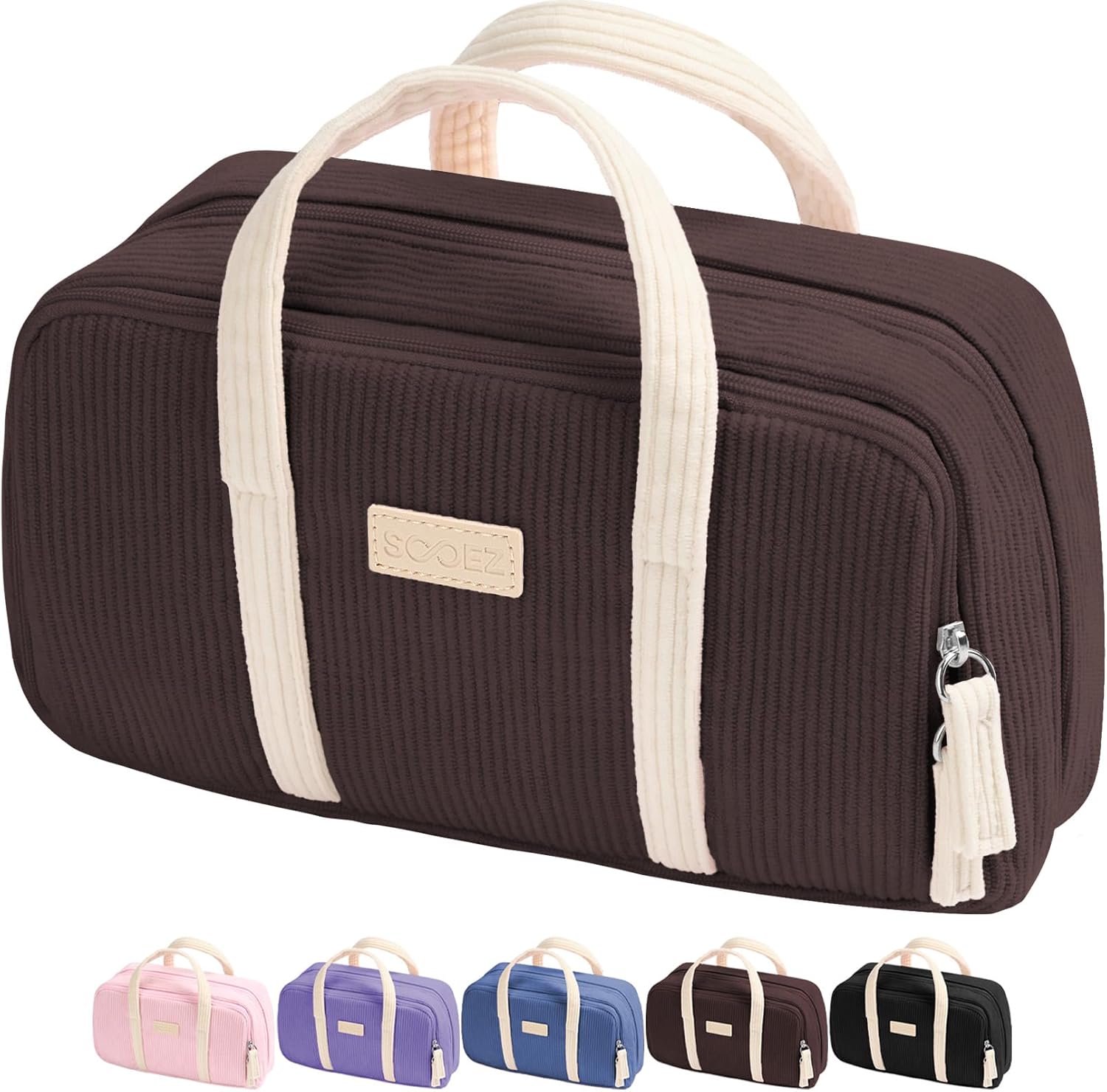 Sooez Large Pencil Case Pouch, Extra Big Pencil Bag with 5 Compartments, Pen Case Wide Opening, Soft Corduroy Pen Bag Organizer with Zipper, Cute Aesthetic School Supplies for Teen Girls, Brown