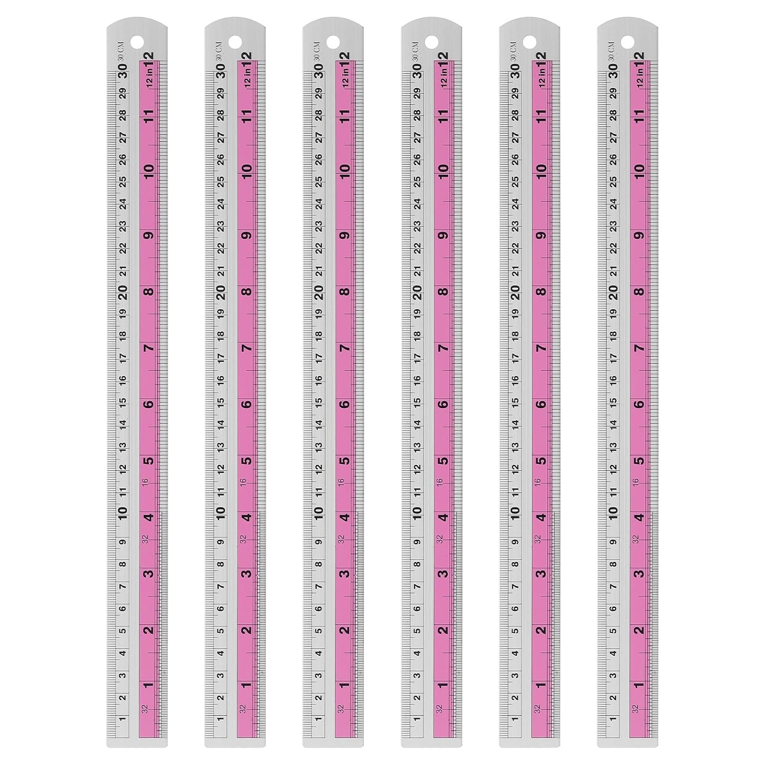 HARFINGTON 6pcs Metal Straight Ruler 30cm Metric SAE Aluminum Alloy Measuring Rulers Scale Tools with Hole for Measure Study Reading Classroom Office, Pink