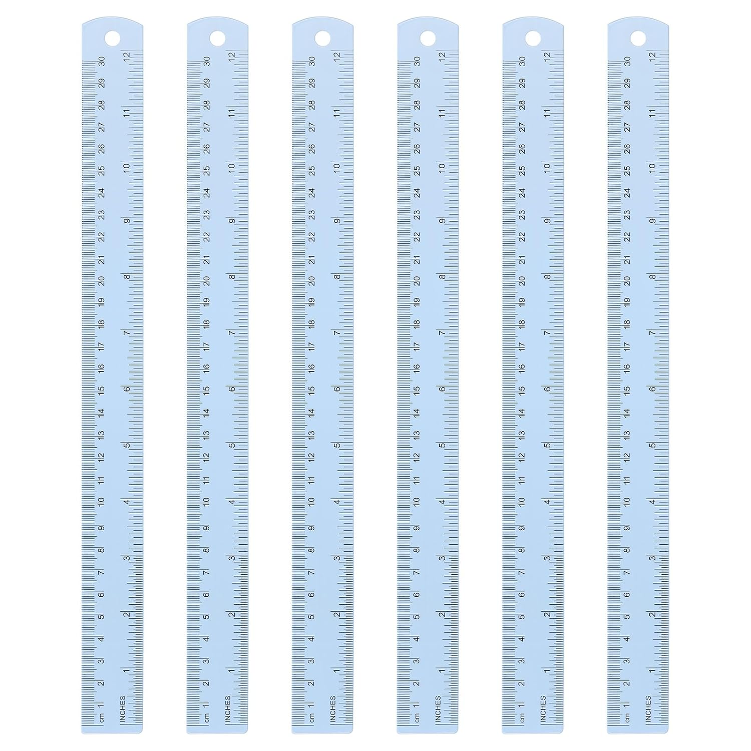 HARFINGTON 6pcs Metal Straight Ruler 30cm Metric SAE Aluminum Alloy Measuring Rulers Scale Tool with Hole for Measure Study Reading Classroom Office, Light Blue